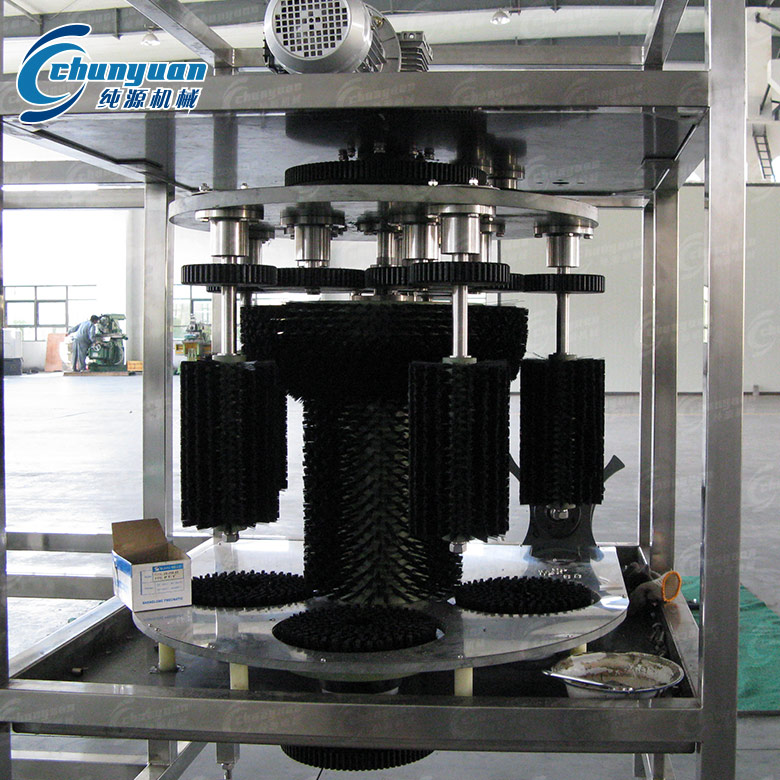 全自動(dòng)外刷桶機(jī)由不銹鋼機(jī)架、封板(不銹鋼〉、主旋轉(zhuǎn)毛刷、毛刷調(diào)速電機(jī)、撥輪調(diào)速電機(jī)、捅底部旋轉(zhuǎn)毛刷、撥輪結(jié)構(gòu)、 沖洗水泵、噴淋室等組成。全自動(dòng)外刷桶機(jī)采用優(yōu)質(zhì)不銹鋼制作,耐腐蝕,易清洗。主要?dú)饴吩捎门_(tái)灣亞德克產(chǎn)品,該機(jī)結(jié)構(gòu)緊湊, 工作效率高且穩(wěn)定可靠,自動(dòng)化程度高,操作簡單。