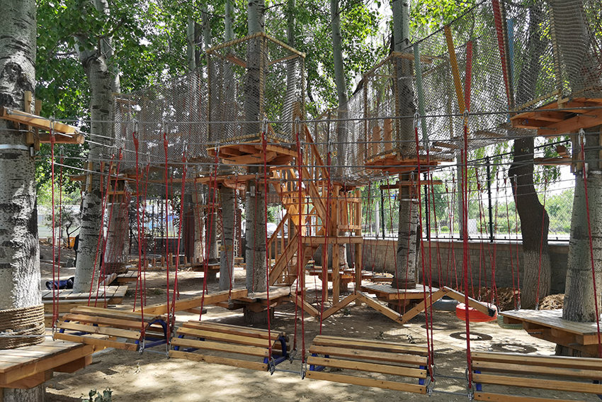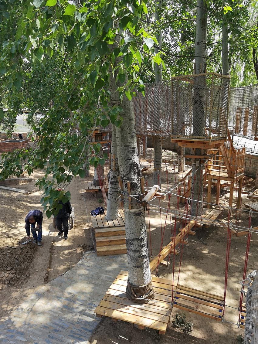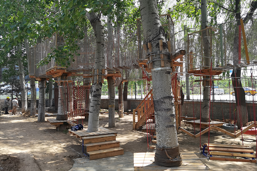 下面是拓展區(qū),適合孩子體能訓(xùn)練,有繩網(wǎng)的保護(hù),高空行走也很安全。