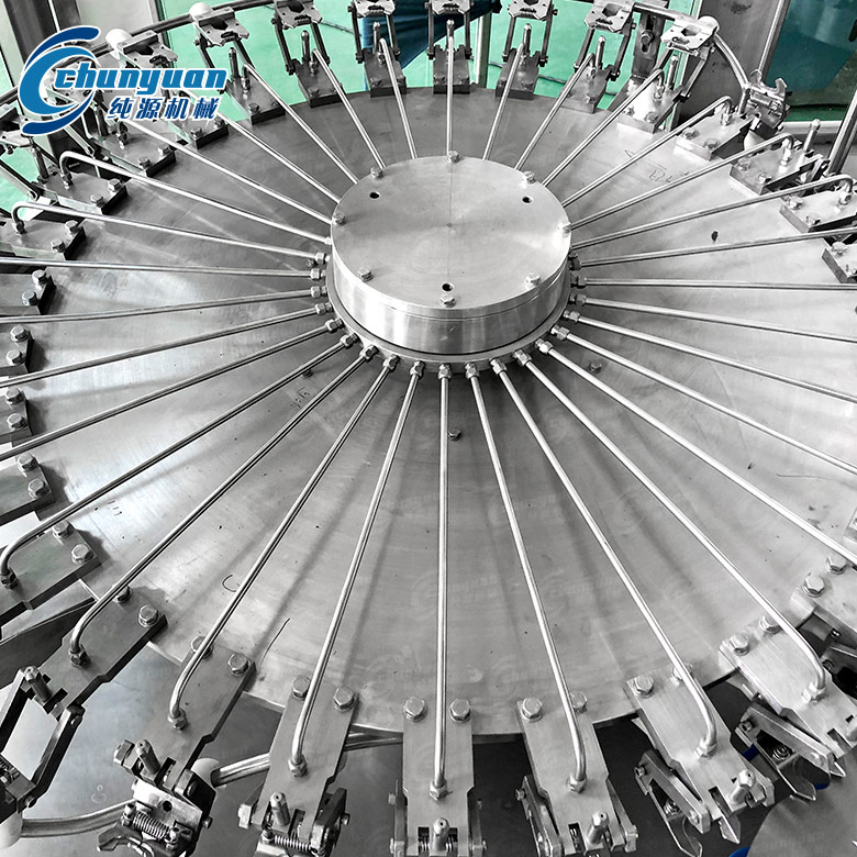 瓶子由通過風(fēng)送道傳遞,然后通過撥瓶星輪傳送至三合一機(jī)的沖瓶機(jī)。沖瓶機(jī)回轉(zhuǎn)盤上裝有瓶夾,瓶夾夾住瓶口沿一導(dǎo)軌翻轉(zhuǎn)180°,使瓶口向下。在沖瓶機(jī)特定區(qū)域,沖瓶夾噴嘴噴出沖瓶水,對(duì)瓶子內(nèi)壁進(jìn)行沖洗。瓶子經(jīng)沖洗、瀝干后在瓶夾夾持下沿導(dǎo)軌再翻轉(zhuǎn)180°,使瓶口向上。